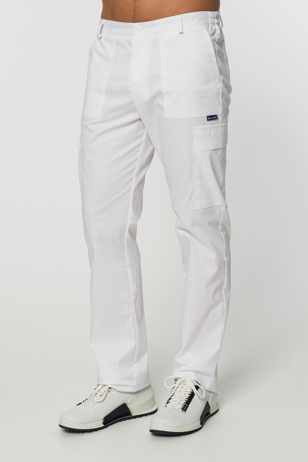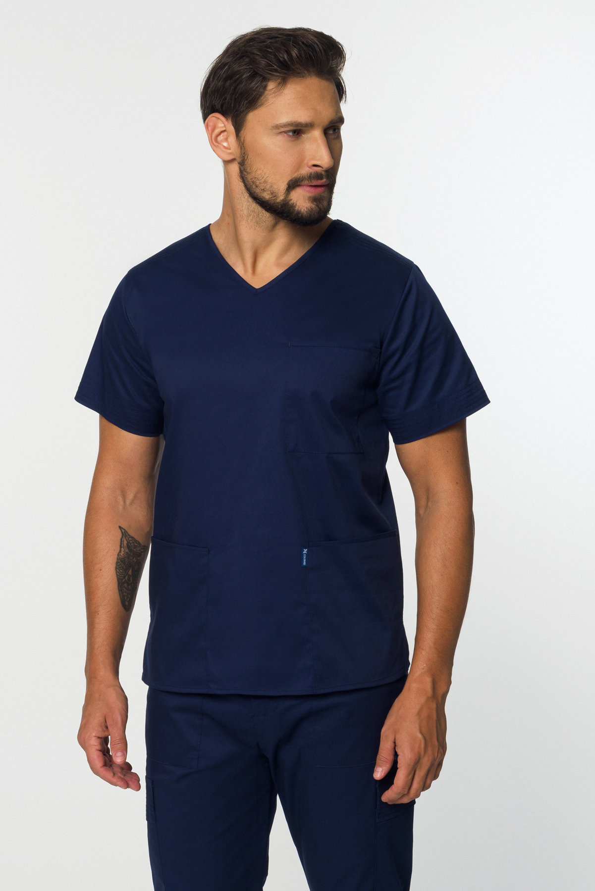 Męski komplet medyczny z elastycznej tkaniny zapewnia pełną swobodę ruchów, nowoczesny wygląd i funkcjonalność. Bluza z 3 kieszeniami i spodnie typu „bojówki” z 6 kieszeniami tworzą wygodny, praktyczny zestaw do codziennej pracy.