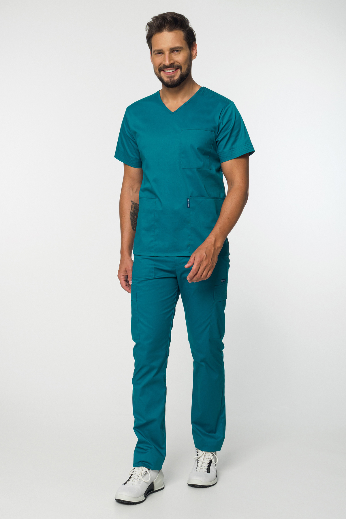 Ten męski komplet medyczny został opracowany z myślą o wymagających specjalistach, którzy potrzebują stroju łączącego komfort przez cały dzień, nowoczesny design oraz praktyczne rozwiązania wspierające intensywną pracę. Elastyczna tkanina dopasowuje się do sylwetki w naturalny sposób, zapewniając pełną swobodę ruchów i profesjonalny wygląd w każdych warunkach.