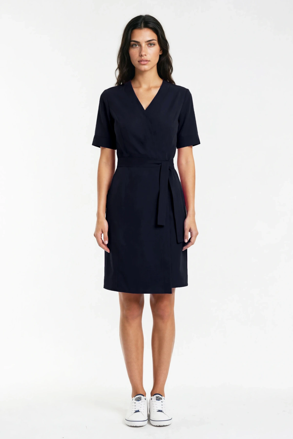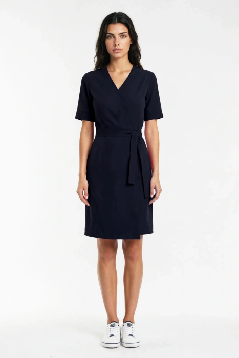 Ta sukienka medyczna łączy subtelną, kobiecą linię z funkcjonalnością niezbędną w pracy. Wiązanie w pasie podkreśla sylwetkę i pozwala na indywidualne dopasowanie, a elastyczna, miękka tkanina zapewnia komfort i pełną swobodę ruchów przez cały dzień.