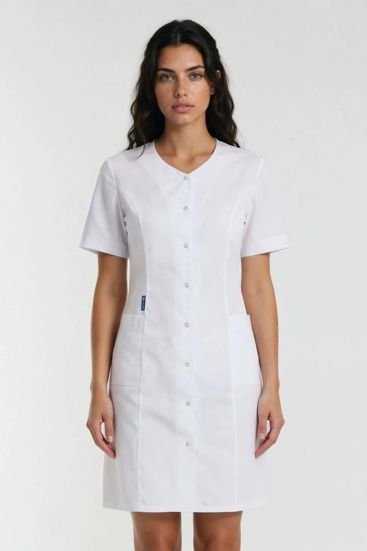 - Klasyczny fartuszek / sukienka medyczna zapinana na najwyższej jakości bezniklowe napy. Wykonany z nowej , miękkiej tkaniny ze zwiększoną zawartością bawełny.